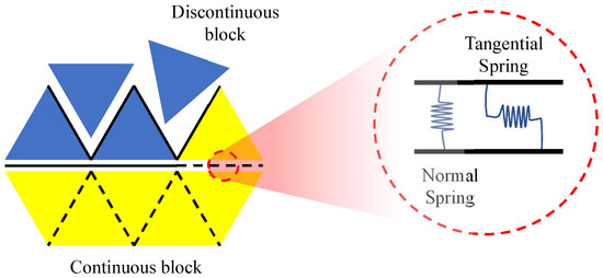 - Interface elementAn interface locates between two block elements. The normal and tangential contact forces of the two elements are the spring forces asThe relative displacements between adjacent elements areThe Mohr–Coulomb criterion is adopted; see Equation (9). When the normal stress of the spring is greater than the tensile strength, the normal spring will break and tensile failure will occur. Similarly, when the tangential spring reaches its strength, the tangential spring will break and shear failure will occur: