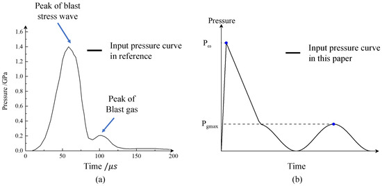 Yuan et al. [34] suggests a time-dependent explosion pressure curve with two peaks, see Figure 3a. The first peak corresponds to the blasting wave, and the second peak corresponds to the gas pressure. As mentioned before, comparing to the explosion stress wave which acts as dynamic loading, the explosive gas permeation process lasts longer, which is considered as a quasi-static loading.