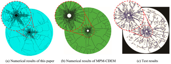 The obtained cracking pattern is shown in Figure 4, compared to the MPM-CDEM results provided by [39] and experimental results provided in [38]. Figure 4 indicates that the explosion pulverized formed a pulverized zone around the blasting hole, and some radial cracks propagate to the edge of the model. Close to the edge of the model, some tangential cracks appear due to stress wave reflection, resulting in a nearly circular fractured region. Assuming the pulverized zone as the blasting funnel, the radius of the blasting funnel and number of main cracks are listed in Table 3, indicating the reliability of our model.