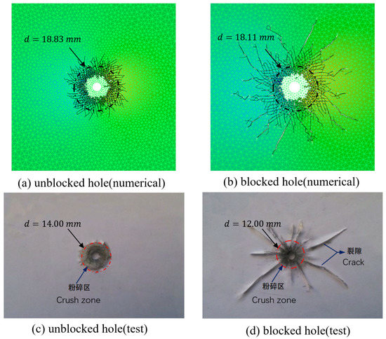 Figure 6a,b show the numerically-obtained results, and Figure 6c,d show the experimental results. It can be seen that, when the hole is not blocked, there is almost no radial main crack. Only dense cracks are generated near the hole, resulting in a crush zone caused by the blasting wave. When the hole is blocked, several radial main cracks are generated, which are caused by the gas permeation. The numerical results agree well with the experimental results, indicating the reliability of the proposed model. We would like to emphasize that we did not use special techniques to simulate explosion crushing area such as element dissolution/deletion because such techniques do not follow mass and energy conservation, which may bring other problems. Hence, in our results, a large number of micro-cracks appeared on the edge of the explosion crushing area in Figure 6.