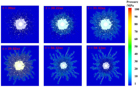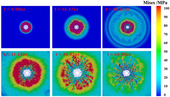 The results of Mises stress are shown in Figure 8. In the beginning of the explosion, the blasting hole area was subjected to strong impacts where the stress peak reached 100 MPa. Before 30 s, the explosive stress wave spread almost symmetrically. It can be found that the blasting wave almost reached the boundary of this region in 30 s. With the propagating of the explosion wave, crushing and cracking zones were formed. When 30 s, the explosive gas permeated into cracks, promoting the cracking processes. At s, the cracked zone was almost formed where the stress concentrations could be found at the tips of cracks. At μs, the explosive gas began to dissipate. (The blue grid is the fracture grid which supports the explosive gas flow in the crack).