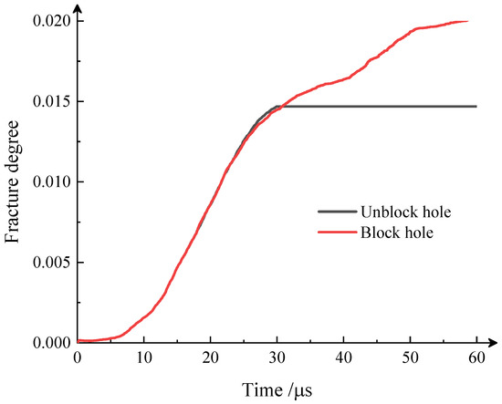 When defining the ratio of the number of broken springs to the total number of springs as fracture degree, the history of fracture degree is shown in Figure 9. It can be seen that, in the first 30 s, the fracture degree of the cases with blocked and unblocked blasting holes are almost the same. After this, the fracture degree of the case with a blocked hole continuously increases, which is 30% higher than the case with the unblocked blasting hole in the final stage. This conclusion is consistent with Ref. [40], and it also verifies the proposed model’s rationality. However, due to the calculation efficiency, the proposed model is only suitable for the two-dimensional case, and the three-dimensional case will take too much time in calculating the explosive gas flow in the crack. This is also our future work.