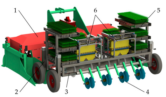 Plug seedling transplanting technology can enable economic crops to overcome unfavorable factors during the growth stage, improve the seedling survival rate, and save planting costs [1,2,3]. With the increasing maturity of this technology, it has been gradually applied to the large-scale planting of economic crops such as vegetables (peppers, tomatoes, eggplants) and fruits (strawberries, watermelons), and can effectively shorten the growing period of crops, alleviate the contradiction of planting seasons, and improve the land replanting index and crop yield [4,5]. At present, the transplanting technology of vegetables in China is still immature and is a mainly semi-automatic transplanting technology. Due to the manual single seedling picking and seedling launching process, its labor intensity is high, and the operation efficiency is low, generally not exceeding 40 plants/(min · row) [6,7,8]. An automatic transplanting machine eliminates the manual seedling-picking process and adds an automatic seedling-feeding plate, seedling picking, and seedling dropping mechanism to the original device, and the single-row transplanting planting efficiency can reach 70–140 plants/(min · row). Therefore, to improve the planting efficiency, it is of great significance to develop a fully automatic transplanting machine [9,10,11].
