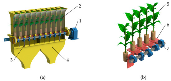 Developed countries such as Europe, the United States, and Japan, where research on seedling transplanting technology started earlier, have gradually applied PLC, single chip microcomputer, and Fuzzy-PID compound control technology with automatic transplanting technology and replaced the manual seedling method with automatic seedling feeding systems, reducing the labor intensity and improving economic efficiency [12,13,14,15]. For the requirements of agricultural cultivation in China, to implement efficient mechanized vegetable cultivation, Chinese scholars have carried out relevant research on automatic seedling supply, seedling collection, and seedling dropping in the whole process of transplanting cavity tray seedlings. Based on a semi-automatic transplanter, fully automatic planting was achieved by combining electric, pneumatic, and hydraulic intelligent control technologies [16,17,18]. According to the number of seedlings harvested at one time, the seedling harvesting process can be divided into single-seedling harvesting and whole-row seedling harvesting. Whole-row seedling picking is relatively efficient, but it needs to enter the lower planting device through a seedling splitting device to solve the problem of single-plant delivery of whole-row potted seedlings. A rotating seedling cup is a common solution for seedling separation [19]. The seedling cup rotates circularly along the horizontal track to catch the pot seedlings. The seedling cup opens the bottom opening at a specific position, and the pot seedlings fall into the lower planting device for seedling separation. It is generally suitable for pot seedlings taken out in a vertical posture, such as clamping stems, and is widely used because of its simple structure and reliable operation. However, limited by its volume and seedling cup open position, a single set of rotating seedling cups has the following limitations: it is suitable for single-row or double-row transplanting and cannot be used for multiple-row planting; it has a large moment of inertia during operation and is not suitable for high-speed planting operations [20,21,22]; and it requires a high seedling docking time and it is difficult to cooperate it with the lower planting device during the seedling dropping period [23].