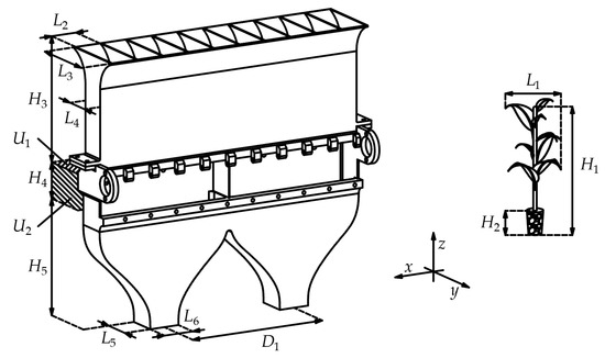 where D1 is the required row spacing for planting operations (200 mm); D2 is the planting ditch width (40 mm); L1 is the average maximum leaf expansion amplitude of pot seedlings (rounded to 100 mm); L2 is the transverse length of the single-chamber opening of the seedling cylinder (40 mm); L3 is the longitudinal length of the seedling cylinder compartment opening (80 mm); L4 is the minimum longitudinal length of the seedling separator (40 mm); L5 is the longitudinal length of the bottom opening of the seedling cylinder (40 mm); L6 is the transverse length of the bottom opening of the seedling cylinder (40 mm); H1 is the average height of the pot seedlings (including the pot body), rounded to 150 mm; H2 is the average height of the pot seedlings with a hole height of 33 mm; H3 is the distance between the top of the seedling cylinder and the plane U1 where the horizontal state of the seedling plate is located, 150 mm; and H4 is the plane U2 in the rotating area of the seedling carrying plate, which is an unsafe area. If the potted seedling falls through the area, the seedling carrying plate rotates and there is a risk of seedling jamming, this being 40 mm. H5 is the height of the safe area for the dropping of the pot seedlings in the seedling cylinder, 150 mm, and H6 is the height of the vertical area of the dropping mouth, 50 mm.