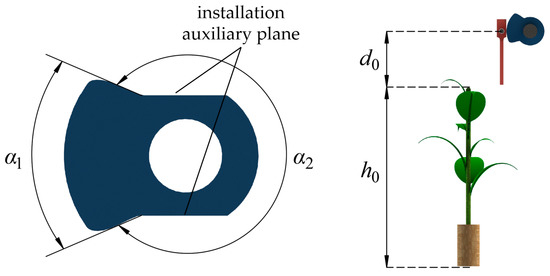 A drive cam was the key component in driving the rotation of the seedling plate, and its profile curve was divided into a horizontal section and a vertical section, corresponding to the two states of the seedling plate, and the corresponding center angles are α1 and α2, respectively, as shown in Figure 8. An installation auxiliary plane was also designed in the horizontal section to facilitate the cam installation to be adjusted the installation angle with an inclinometer.