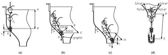 Taking the pot seedling at the No. 1 position as the research object, its dropping process could be divided into the following four stages: (1) after dropping off from the seedling tray, it falls freely from position A to position B, and a collision occurs at position B (Figure 9a); (2) after the collision, the pot seedling is toppled and slid to position C along position B on the inner wall of the seedling cylinder (Figure 9b); (3) after the pot seedling reaches position C, it loses the support of the inner wall of the seedling separating cylinder and carries out an oblique launching motion and collides with point D of the inner wall of the seedling separating cylinder on the opposite side (Figure 9c); (4) the pot seedling continues to fall after the collision at position D. During the dropping process, the leaves of the pot seedling are constrained by the position of the dropping mouth and the seedlings are adjusted to fall vertically until reaching the lower planting tank.