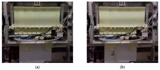 The nursery board was opened, and the potted seedlings were held with both hands so that the lower end of the pot was flush with the initial drop height, and the potted seedlings were then released to let them fall freely. During this period, the potted seedlings were filmed using high-speed camera equipment at 240 frames/second. After the shooting was completed, the generated video was 30 frames/s, which was eight times slower. After exporting the video, video clip software was used to process the video. The video start point was moved to the frame where the pot seedlings started to fall (Figure 11a), and the video end was moved to the frame where the pot seedlings completely fell out of the seedling cylinder (Figure 11b), and the video duration Ui was obtained. Equation (30) was used to calculate the net dropping duration tj of the pot seedlings at each position. The theoretical calculation accuracy of this method was 0.0047 s, which was the corresponding time length of one frame at the shooting rate of 240 frames/s, that is, 0.0047 s. In the actual calculation process, the counting accuracy was 0.01 s.