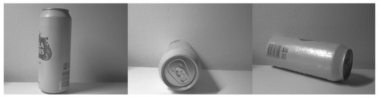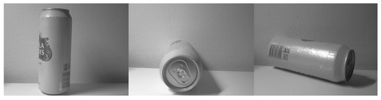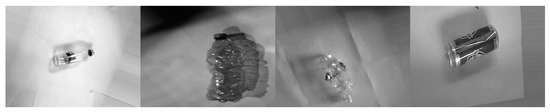 To expand the dataset, the mechanical and thermal loading on plastic and aluminum packaging was applied to change their shape. The glass packaging could not undergo such modification since it is a hard and brittle material and would shatter under mechanical loading or would crack at higher temperatures. The application of such external loading on packaging greatly increased the dataset size as well as its quality. Additional improvement of dataset quality was conducted by photographing a group of packaging. The examples of packaging deformed by the application of thermal loading, mechanical loading, and a group of all three are shown in Figure 2.