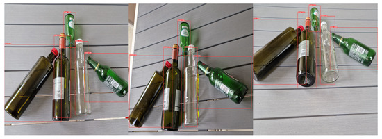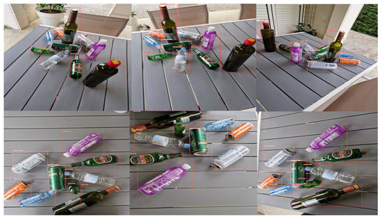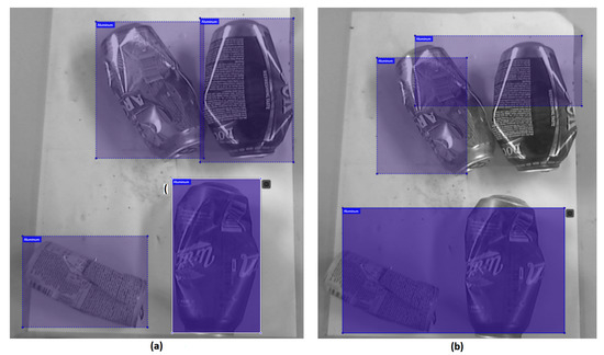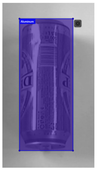In Table 1 the number of original, augmented and total images for each class (plastic, glass, and aluminum) is shown. From the number of original images per class, it can be seen that the dataset was not perfectly balanced [38]. The augmentation was used to compensate for the dataset imbalance and improve its quality [39]. After the original dataset was obtained and augmentation performed the next step was labeling the bounding boxes for the YOLOV4 algorithm using Visual Object Tagging Tool (VoTT) [40]. The marking of masks, i.e., border frames for a single image is shown in Figure 4.