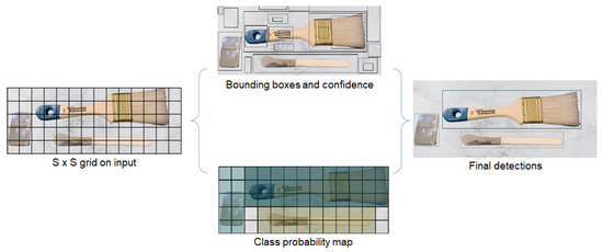 As seen in Figure 6, each matrix provides boundary frameworks and calculates a reliability estimate for the corresponding framework. After the reliability estimate is calculated the reliability score is determined which shows how secure the model is and that the frame contains the object [45]. This type of detection algorithm has several advantages: it can recognize several objects in one frame [46], during testing the entire image frame is reviewed so that predictions are based on the global image context and it also provides predictions with a single evaluation of the network as unlikely similar methods such as R-CNN which require thousands of examples of a single image [47,48]. Due to the aforementioned properties, the YOLOV4 algorithm is extremely fast even up to a thousand times faster than R-CNN, and up to a hundred times faster, than Fast R-CNN [49]. The YOLOV4 design allows end-to-end training and real-time speed while maintaining high average accuracy [50] and its flow chart can be seen in Figure 7.