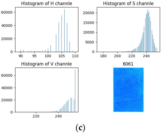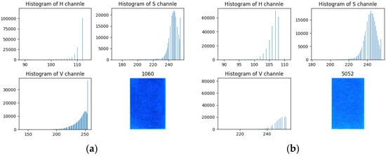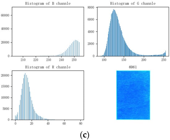- The surface features of the aluminum blocks were extracted by machine vision, and results under different light sources and angles were compared. A blue light source and 45° angle lighting were selected, and the features of the acquired images in the RGB and HSV color spaces were compared. It could be seen that 1060 significantly differed from 5052 and 6061, and 5052 and 6061 could also be distinguished by setting the threshold value.