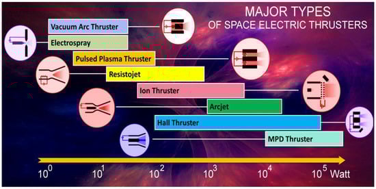 The aim of this Opinion article is not to provide a comprehensive review of the current state of the art for modern space propulsion systems, though interested readers are directed to the most recent reviews where electric propulsion systems, including their operating principles for various types of propulsion platforms and their key characteristics, are discussed in significant depth [5,23,24,25,26]. Instead, the core objective of this article is to emphasize the importance of such features of space electric propulsion systems as: