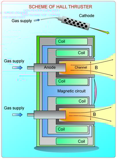 Unfortunately, electromagnets undergo extensive heating with the increase of the coil current, which is the reason a magnetic field of 1 T is necessary to operate a miniaturized arc thruster can only be obtained in the pulse mode. Additionally, electromagnets significantly increase the weight of the device, and require a power supply. Thus, due to the large range of the applied magnetic field and the necessity of flexible operation of the thrusters, a combination of permanent magnets that are able to generate a strong but constant magnetic field, and electromagnets that can adjust the magnetic field strength, is considered. Figure 7a presents a schematic of a typical Hall-type thruster, while a hybrid magnetic system [122] of a small Hall thruster (23 mm diameter) is shown in Figure 7b. As can be seen, the permanent magnets are engaged to ensure the principal magnetization, while the electromagnetic part serves to adjust the magnetic field to the specified parameters.