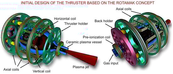 Several types of electromagnetic plasma thrusters were recently developed by various research groups [80,81,82]. One of the characteristic examples of the rotational system (which is yet quite far from space testing) is the miniaturized Rotamak-type device, which was initially suggested for the experiments with hot plasma for thermonuclear fusion [83].