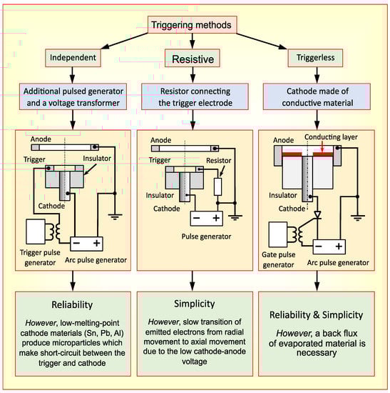 For the resistance triggering, the voltage between the cathode and anode should be relatively low, thus leading to the generation of a much weaker axial electric field, as compared to the independent triggering, so the transition from the radial to axial expansion of the flux of plasma electrons is relatively slow. Moreover, the independent triggering ignites more symmetric discharge with respect to the setup axis of symmetry. The last method, i.e., triggerless, was initially proposed for the vacuum arc deposition setups, where a part of the material evaporated in the arc discharge is deposited on a surface of the igniting electrode, namely in the gap between the cathode and anode [91]. At the next ignition cycle, the deposited layer is heated resistively, and evaporates at the electrical breakdown of the gap.