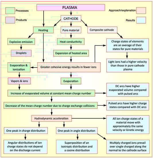 The second stage is plasma plume formation and control of ion energies. Traditionally, in the setups of vacuum arc technology an axisymmetric magnetic field was applied to form the shape of the extracted ion flux [93,94], and the idea was adopted in VACs [95]. The composite cathodes made as alloys of heavy and light metals, allow the expansion of the set of options with respect to the plasma plume. The non-uniformity in the chemical composition causes the re-distribution in the discharge, when the heavier ions concentrate on the discharge axis of the angular distribution, and the lighter ions gain more kinetic energy in comparison with the pure metal cathodes. At the same time, a pulsed mode of electric supply was considered as the best way to obtain the multiple charged ion flux after a number of experiments [96]. The ways to affect the ablation and ion charge states distribution are summarized in Figure 6.