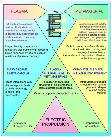 For the interaction with cold plasma when the electron temperature does not exceed a few tens of electron-volts, three possibilities can be considered to boost space propulsion technologies via advanced metamaterials (Figure 7). Several possible approaches to this are illustrated in Figure 8. The first way depends on the large diversity of plasma species, their mobility, their extraordinal chemical activity and their flexibility towards the control means. Due to its ability to be guided by pressure gradients, friction forces, and electric and magnetic fields, plasma is a perfect tool to modify materials through sputtering, etching and other ballistic and thermal effects. As a result, complex hierarchical micro- and nanostructures are synthesised on various substrates, thus forming a unique platform for future applications [67,105]. The second possible application arises due to the effect of the generation of patterned spatial distributions of electromagnetic fields and charged particles, thus creating the complex plasma structures that can be implemented in space propulsion. For example, metamaterial composed of split ring resonators (SRR) produces shifted SRR resonance when interacting with low-pressure argon plasma [106].