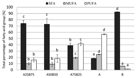 Considering the content of PUFA in the tested oil mixture samples, this group was dominated by linoleic acid (C18:2, n-6c), with 4.6–39.05% content, and α-linolenic acid (C18:3, n-3), with 0.35–2.45% content. Additionally, in the case of sample A75B25, a trace amount of eicosatrienoic acid (C20:3 n-3) was observed.