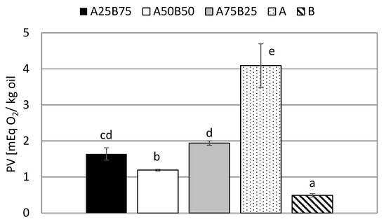 The highest level of peroxide value was observed for sample A (4.09 meq O2 kg−1 oil). The sample mixture difference in the oxidative stability between the lowest and the highest peroxide value was 0.75 meq O2 kg−1 oil.