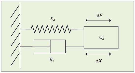 where Md, Bd, and Kd represent, respectively, the virtual inertia, virtual damping, and virtual stiffness of the robot, is a deviation between the environmental force and the force expected, and is the position increment. To realize the robot control, the second-order difference expression of admittance controller could be obtained after the discretization of Equation (4) with the bilinear transformation, and could be expressed as follows: