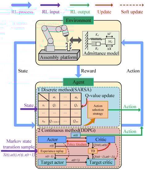 In addition to the above methods, reinforcement learning (RL), an important branch of machine learning, has become a promising method for solving unstructured tasks [12]. A variable impedance controller is adopted based on the fuzzy Q-learning algorithm to yield compliant behavior from the robot during the hole insertion process [13]. Nevertheless, the above approach outputs the discrete actions by discretizing the action space, which inevitably affects the learning effect of the algorithm. Deep reinforcement learning (DRL) [14] can solve the continuous-state input problem, and is widely used in high-dimensional state–action spaces. The impedance policies for small peg-in-hole tasks are learned using the DRL algorithm [15]. The robot learning the skill of precise insertion is realized with the DQN, but only implemented on 4-DOF [16]. A general learning-based algorithm, DDPG, is proposed to perform different assembly tasks well, but it requires some prior knowledge [17]. We noticed that the DRL improved the assembly effect of the robot in unstructured environments, yet led to massive data requirements during the training process. Many recent methods focus on the above problems [18,19,20]. Related work [18] has demonstrated that the action space reformulation can effectively reduce data requirements. Since the admittance controller can adapt to environmental contact forces, the RL method with an admittance action space can obtain the dynamic relationship between force and motion to realize continuous assembly tasks [19,20]. Thus, we define the admittance parameter identification process as a MDP problem and solve it with the SARSA and DDPG algorithms, respectively. This article proposes methods of admittance parameter identification using the SARSA and DDPG algorithms to realize variable admittance control to improve the assembly effects. Furthermore, a fuzzy reward system is established to evaluate the action–state value to solve the complex reward establishment problem. Finally, in a peg-in-hole assembly task, the proposed methods are verified and the results of different methods are compared.