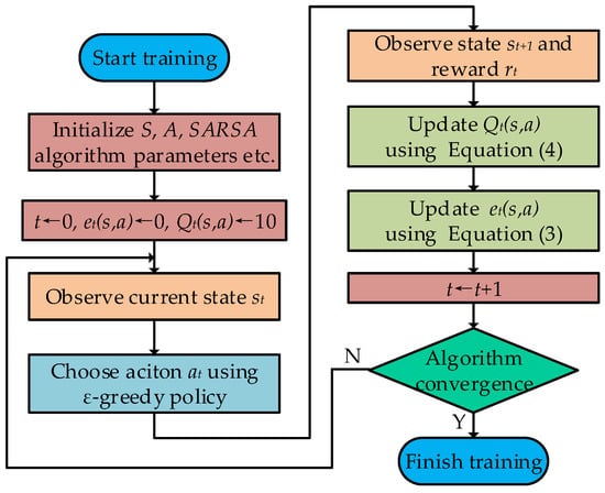 where λ represents the decay factor, ω represents the positive weight, and s = st and a = at represent the selected state–action. After the input state st and output action at were determined, the qualification trace function et(s,a) was updated, where the selected state–action increased the corresponding weight, and the others decayed proportionally. Then, the state–action value Qt(s,a) update could be expressed as: