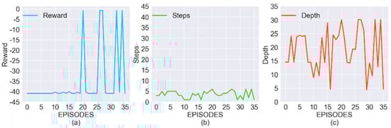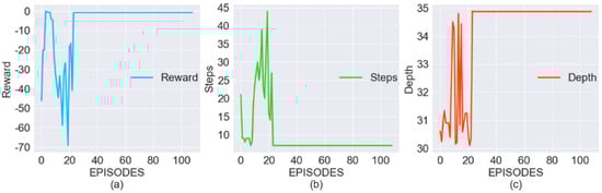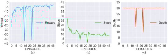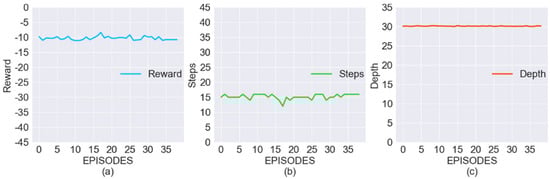 The results of assembly experiments using position control. (a) Cumulative reward in each episode; (b) Adjustment steps in each episode; (c) Insertion depth in each episode.