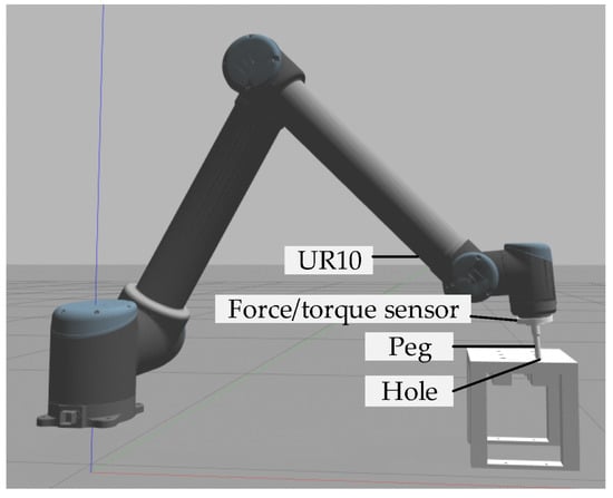The experimental platform is shown in Figure 6, where a M4313M2B force/torque sensor was mounted on the end effector of manipulator UR10 and used to collect raw force/torque data from the environment. Notice that the raw force/torque data were processed with a gravity compensation algorithm to obtain the real contact force and torque. Furthermore, the peg was mounted on the force sensor, and the hole was fixed on the experimental table. The diameter and length of the peg were 10 mm and 40 mm, respectively. The diameter of the hole was 13 mm.