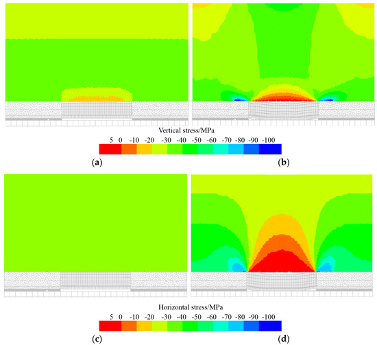 - After the formation of the goaf, the tensile stress in the middle of the thick-hard stratum was concentrated, and the compressive stress on both sides of the goaf was concentrated. Therefore, the central and end parts easily produced tensile and shear failure, respectively.
