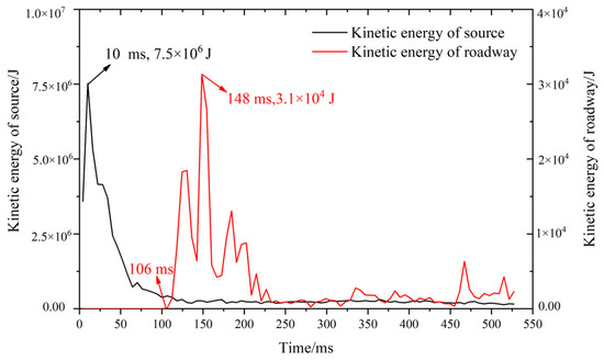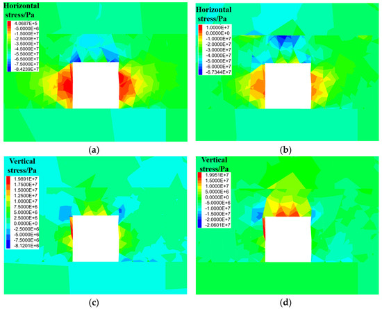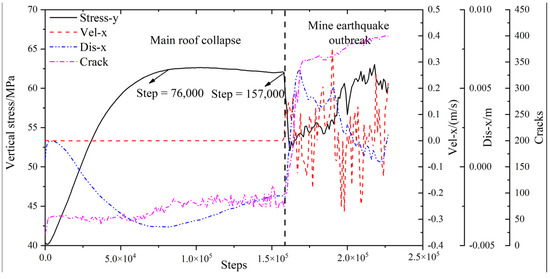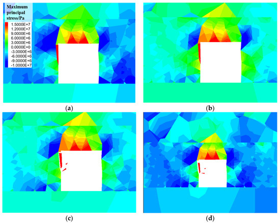 - The whole process of roadway failure induced by the superposition of dynamic and static loads was simulated in detail. First, the state of the roadway surface changed from compressive to tensile stress once the goaf was formed. After the arrival of the stress wave generated by a tremor, the tensile stress on the roadway surface further increased until it exceeded the tensile strength, and the surrounding coal and rock gradually broke and led to a rockburst occurring.