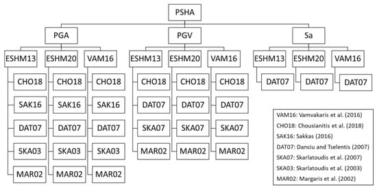The logic tree constructed to calculate PGA, PGV, and Sa. All branches have the same weighting coefficient. Results were generated for return periods of 475 and 950 years for both PGA and PGV and 475 years for Sa. Abbreviations: VAM16: Vamvakaris et al. [65], CHO18: Chousianitis et al. [78], SAK16: Sakkas [77], DAT07: Danciu and Tselentis [76], SKA07: Skarlatoudis et al. [75], SKA03: Skarlatoudis et al. [75], MAR02: Margaris et al. [74].