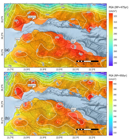 The spatial distribution of the PGA, computed via the logic tree approach (Figure 2) for a return period of 475 years, is illustrated in Figure 3a. The highest values were identified in close proximity to the coastline, near the towns of Nafpaktos and Aigion. The PGA decreased towards the north and reached its minimum of about 250 cm/s2 at the NE edge of the study area. A maximum of ~325 cm/s2 was obtained approximately 5 km SSE of Aigion. The difference between the highest and the lowest values was 75 cm/s2, which indicates that their variation was low to intermediate. The spatial distribution pattern of the PGA for a return period of 950 years was nearly identical (Figure 3b). A maximum of ~400 cm/s2 was found SSE of Aigion, meaning that there was an increase of 75 cm/s2 compared to RP = 475 yr. The lowest value was about 300 cm/s2, increased by 50 cm/s2 from the respective value obtained for the return period of 475 years.