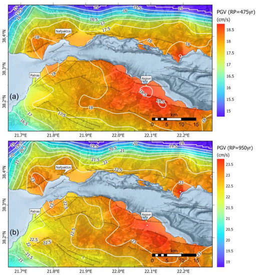 Spatial distribution of PGV values for (a) RP = 475 yr and (b) RP = 950 yr.
