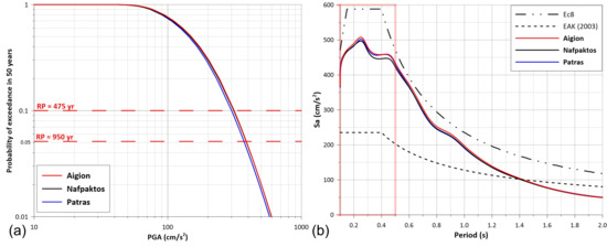 Hazard curves were also generated for the three main WGoC city and towns; namely, Patras, Nafpaktos, and Aigion (Figure 5a). PGA values were calculated for a range of exceedance probabilities in 50 years to observe the increase rate for the PGA as a function of the return period. The hazard curves were proximal to each other, indicating that the level of seismic hazard was similar among the three sites. Patras presented a slightly lower PGA than Nafpaktos and Aigion. It could not be determined whether Aigion or Nafpaktos exhibited higher seismic hazard, as the PGAs were almost identical between the two cities. It is worth noting that the value of 1000 cm/s2 was exceeded only for very small probabilities of exceedance, which implies that such extreme ground motions are unlikely to be reached. The last output of the PSHA calculations was the computation of Spectral acceleration (Sa) values for periods ranging from 0.1 s to 2.0 s in the three aforementioned sites in order to construct uniform hazard spectra (Figure 5b). The Sa curves for Patras, Nafpaktos, and Aigion were very similar to each other throughout all periods. This was reasonable in light of the close geographical distance among them. As illustrated in both PGA and PGV maps, the city and the two towns were adjacent to regions of comparable maximum expected ground motions. The maximum of the three spectra was about 500 cm/s2 at a period of 0.25 s. The curves seemed to be nearly identical for periods above 0.9 s. Thus, at high periods, there was almost no difference between the three sites. Minor deviations were detected in the period range [0.3, 0.5] s, for which Nafpaktos seemed to have slightly lower Sa values than Patras and Aigion. The elastic design spectra proposed by the Current National Building Code (EAK2003) [109] and Eurocode 8 (Ec8) [110] were also plotted to investigate their relation with our results. The seismicity was defined as high (type I) and the soil as bedrock (type A) to match the input data of the herein proposed model. The Ec8 spectrum overlay the spectra of the three urban areas for all periods, while that of EAK2003 covered the spectra for the period range [1.4, 2.0] s.