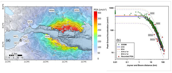 In order to assess the ground motion variability caused by the Aigion 1995 mainshock, PGA values were computed on a grid enclosing the area under study, with nodes at a spacing of 0.03° in latitude and longitude. The spatial distribution of synthetic PGA values is depicted in Figure 6a, along with the surface projection of the activated fault [29] and the available recorded PGA. The highest values estimated onshore exceeded 500 cm/s2, whereas in the city of Aigion, where the highest observed PGA was reported, they were close to 300 cm/s2. The spatial distribution of simulated values was similar to those presented in other studies [88,111], despite using diverse input parameters. The validation of the final parameters used in the simulation is shown in Figure 6b, where simulated PGA values are plotted against those derived from the selected GMPEs and the recorded ones as a function of Joyner and Boore distances (Rjb). The functional form of the GMPEs used corresponded to a normal faulting style and type C (NEHRP) soil condition. As shown in Figure 6b, the PGAs obtained from EXSIM were in good agreement with the GMPE curves throughout the entire Rjb range, except for the points that lay very close to the surface projection of the fault plane (Rjb ≤ 2–3 km). This was, however, anticipated, given that GMPEs are generally not fully capable of reliably reproducing the ground motion in very short distances due to the limited availability of near-fault strong motion datasets, which affects their formulation. Moreover, directivity effects may have a strong influence on near-fault ground motion that is not fully captured by the GMPEs used. In this case, for example, the high PGA value recorded in Aigion (AIGA; Figure 6b) has been attributed to forward rupture directivity, in addition to local soil and topographic characteristics [29,111]. Nevertheless, the overall PGA variability lay inside the ±1σ range for both GMPEs in the entire Rjb range. Regarding the attenuation pattern, PGAs prescribed by the A14 and B14 models appeared to decay slightly faster than the simulated ones; however, taking into account the fact that the same finding also applied to the recorded ones (red triangles; Figure 6b), this highlights the importance of retrieving region-specific parameters that can be incorporated into GMPEs. The finally adopted synthetic PGA values were obtained based on the desire to achieve the right balance between keeping the lowest misfit among synthetic, GMPE-derived, and real values. Consequently, as shown in Figure 6b, our simulations were capable of reproducing the PGAs recorded from the two closest stations (AIGA, AMIA) more closely than the GMPEs, whereas at larger distances the general trend of the recorded PGAs (which presented a relatively high variability in certain cases) was captured by both GMPEs and synthetic values.