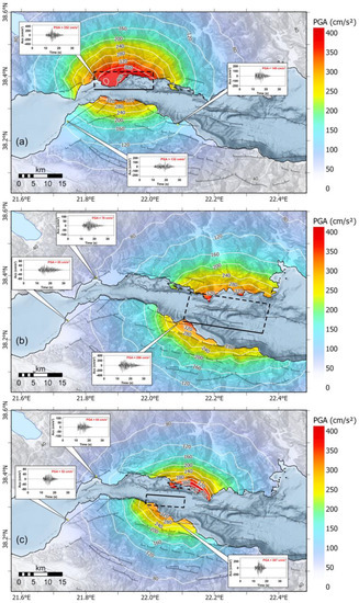 In all cases, the maximum PGAs, located at the surface projection of the faults or nearby, appeared to be relatively close, ranging from approximately 350 to 450 cm/s2. The HF may have had larger dimensions among the three cases, but PF produced the highest acceleration values onshore (Figure 7a), even though it was assigned a slightly lower Mmax (6.3) than HF (6.4; Table 2).