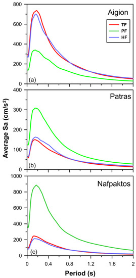 Response spectra of the selected earthquake scenarios for (a) Aigion, (b) Patras, and (c) Nafpaktos corresponding to 5% damping. TF: Trizonia Fault, HF: Helike Fault, PF: Psathopyrgos Fault.