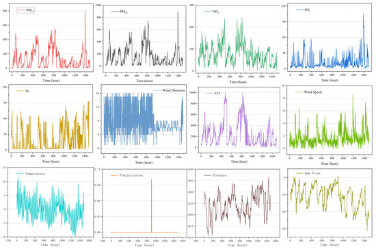 In this paper, hourly air quality concentration and meteorological data from twelve national ambient air pollutant monitoring stations during the period 1 March 2013 to 28 February 2017 were taken from the website of the University of California, Irvine (https://archive.ics.uci.edu/ml/datasets/Beijing+Multi-Site+Air-Quality+Data, accessed on 21 July 2022). The obtained air pollutant data (Table 1) include hourly PM2.5 and PM10. Hourly meteorological data obtained include temperature and pressure. The numerical changes of factors in Figure 3 are in the temporal dimension from 1 December 2016 to 31 January 2017.