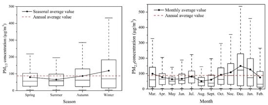As shown in Figure 4, in different seasons and months, the PM2.5 concentration varied considerably. The PM2.5 concentration was low and stable in summer, higher in autumn and spring, and most severe in the winter. This is because the high temperature in summer can lead to atmospheric instability, triggering an increase in rainfall and high humidity, leading to large-scale wet deposition of suspended particles [35]. PM2.5 concentration was higher during spring than summer but showed a decreasing trend. In March, dry weather and high winds produced more soil dust, but air pollution eased as temperatures rose and rainfall increased in April and May. In autumn, seasonal factors such as weak winds, steady climate, and more frequent burning of biomass during harvest season [36] contributed to an increase in pollutants. In Beijing, the high PM2.5 concentration mainly occurred in winter, from November to February, with the peak occurring in December. The highest PM2.5 concentration in winter was mainly due to coal heating, burning of biomass, and fireworks during the Spring Festival, which has a great adverse effect on the atmospheric environment [37]. Furthermore, in winter, when the dry climate is unfavorable for air dispersion, suspended particles, organic or inorganic, could also lead to large amounts of pollutants in the air.