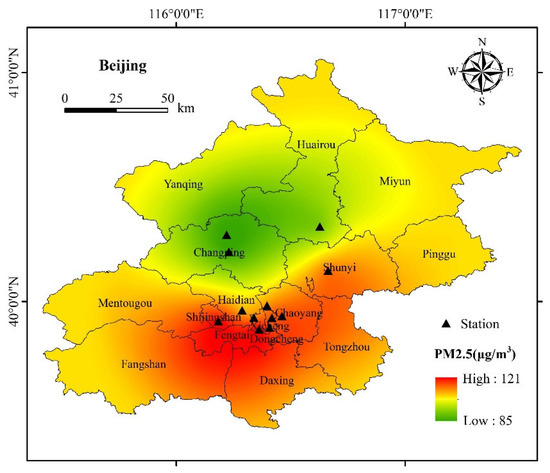 In terms of the temporal dimension, there was a significant seasonal variation in PM2.5 concentrations, which show a declining sequence of winter, spring, autumn, and summer, with a U-shaped change on both seasonal and monthly scales. From the spatial dimension, PM2.5 concentration was higher in the southeastern part of Beijing, lower in the northwestern part of the city, and gradually declined from the heart of the city towards the countryside.