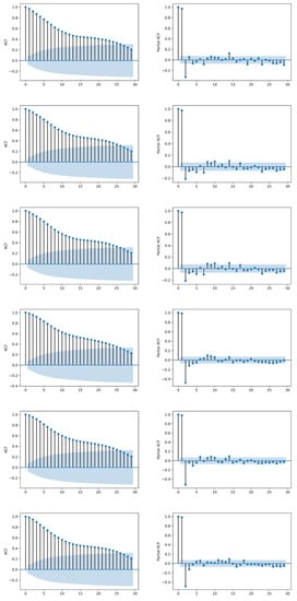 In order to clearly describe the prediction results of the model, examples of the Autocorrelation Function (ACF) and Partial Autocorrelation Function (PACF) are plotted in Figure 6. We use the predicted results of the model to make an example diagram. Compared with other models, the prediction results of our model also have a significant correlation. This shows that our model is superior to other models.