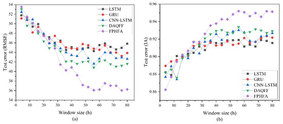 In addition, the selection of window size (representing the input size of the model’s historical observations) also has an impact on short-term prediction performance. We investigate the influence of the window size for the deep learning model in the Beijing dataset. As shown in Figure 7, when the window size is larger than 32, the FPHFA model outperforms the other models in prediction performance. This is due to the fact that when the window is too tiny, the historical data available for learning is insufficient, and the capacity to forecast is hampered by data from nearby sites, leading to inaccurate PM2.5 concentration predictions by the FPHFA model for the target station. The FPHFA’s performance evaluation indicators optimize as the window size increases, and the RMSE of FPHFA reaches its minimum value (and IA its maximum) when the window size is about 56. Beyond this point, the model performance evaluation indicators remain constant or slightly increase, which may be a sign that the prediction models are overfitting.
