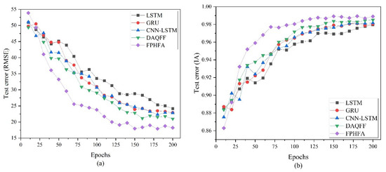 Next, we study the influence of the number of epochs on prediction performance by the different models. Figure 8 shows the model performance evaluation indicators (RMSE and IA) curves of the FPHFA relative to different epochs and provides comparisons with other prediction models. It is evident that FPHFA consistently outperforms the other deep learning models at almost any number of epochs. Moreover, the RMSE of FPHFA reaches its minimum (and the IA its maximum) when the number of epochs is about 150. This is followed by progressively unstable model performance as the epoch size keeps expanding. It is clear that as the number of epochs increases beyond 150, the generalization capacity does not. In addition, the optimization of all models seems to be a bit slow, and overfitting seems likely when the number of epochs exceeds 150. The more epochs there are, the more computational resources are used. On the other hand, as epochs increase, the training performance of the model may improve, but this can also lead to overfitting problems.