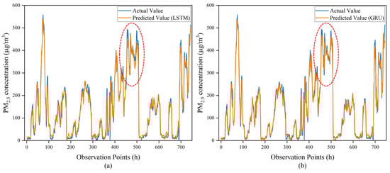 In order to verify the prediction performance of the model in different periods, we divided the data into four groups according to seasons and used the model to predict the pollutant data in different seasons. Table 4 and Table 5 show the comparison of the five deep-learning models in different seasons. For the prediction of pollutant concentration in different seasons, the model we designed has achieved the optimal prediction results. In addition, it is obvious that the prediction accuracy of the model has some seasonal differences. In terms of reducing the prediction error and improving the consistency between the predicted data and the real data, the prediction results of the model in different seasons are not the same. In the spring and summer forecast, the forecast error is low, but the consistency between the predicted data and the real data is not high. In autumn and winter, larger forecast errors correspond to a higher agreement. Considering the seasonal characteristics of PM2.5 concentration, we found that the prediction error may be related to PM2.5 concentration and dispersion in different seasons. In summer, PM2.5 concentration is usually low, and the prediction error is small, but the consistency between the predicted value and the real value is not high. In winter, the concentration of PM2.5 is high, the dispersion is large, and the uncertainty of the variation of pollutant concentration is also high, which leads to the difficulty of pollutant prediction. High PM2.5 concentration limits the prediction ability of the deep learning model, leading to the largest prediction error in winter among all seasons [41]. This is also the reason why the PM2.5 concentration values in December 2016 and January 2017 were selected as the prediction criteria in this study.