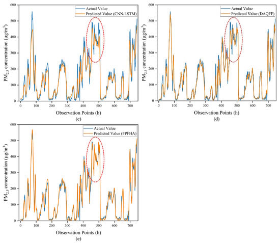 Predictions 12 h ahead in experiments on the Beijing dataset. The graphs compare one month’s worth of actual and predicted PM2.5 values (1 December 2016–31 December 2016) at station 1003A with different models. (a) LSTM; (b) GRU; (c) CNN-LSTM; (d) DAQFF; (e) FPHFA.