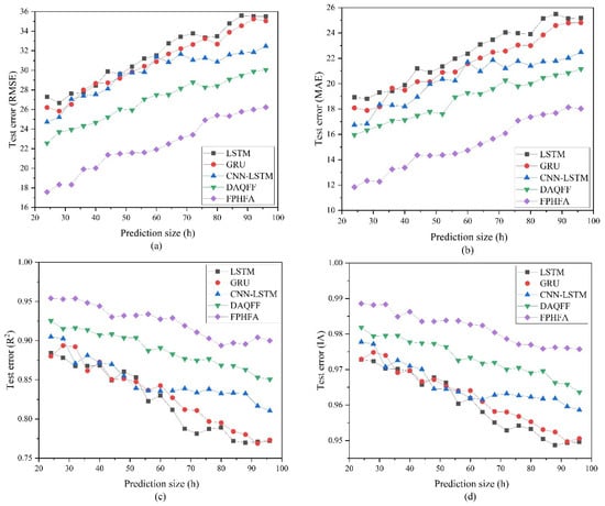 The impact of prediction size on FPHFA and other deep-learning models is then examined. Figure 10 shows that as the forward prediction size increases, the performance of the prediction for those models gradually decreases. It is important to note that the model performance evaluation indicators of traditional deep learning models are comparable to and occasionally even superior to those of CNN-LSTM when the prediction size is smaller than 60. Does this imply that CNN-LSTM’s predicting performance is inferior to some traditional deep learning models? In fact, such is not generally the case, as Figure 10 also shows that the prediction performance of the hybrid deep learning models exceeds that of the classical deep learning models as the prediction horizon lengthens. Moreover, compared to models, the predicting performance of the LSTM, GRU, and CNN-LSTM models exhibits large fluctuations in long-term prediction at certain prediction horizons (e.g., 24–36 h, 72–84 h). The findings in Figure 10 are very noteworthy since they show that as the prediction size increases, FPHFA outperforms other models at any prediction time step (24–96 h) and is more stable. Moreover, we observe that compared with other models, FPHFA also has the lowest prediction error (RMSE and MAE) and the highest prediction accuracy (R2 and IA) at different prediction sizes.
