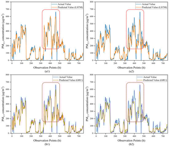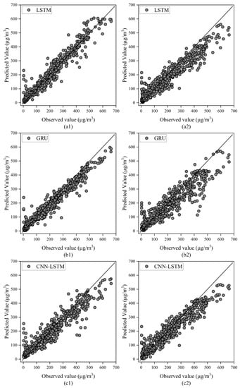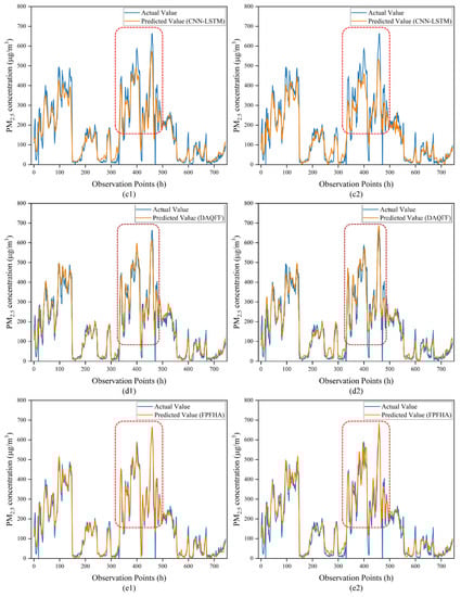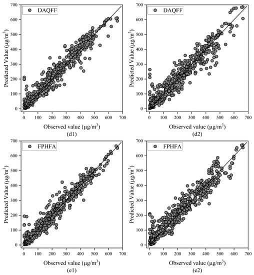 Degree of fit between the observed and predicted PM2.5 value throughout the course of a month (16 December 2016–15 January 2017) with different models (LSTM, GRU, CNN-LSTM, DAQFF, and FPHFA) for prediction horizons of 24 h and 96 h, in experiments on the Beijing dataset. (a1) LSTM model for prediction 24 h ahead; (a2) LSTM model for prediction 96 h ahead; (b1) GRU model for prediction 24 h ahead; (b2) GRU model for prediction 96 h ahead; (c1) CNN-LSTM model for prediction 24 h ahead; (c2) CNN-LSTM model for prediction 96 h ahead; (d1) DAQFF model for prediction 24 h ahead; (d2) DAQFF model for prediction 96 h ahead; (e1) FPHFA model for prediction 24 h ahead; (e2) FPHFA model for prediction 96 h ahead.