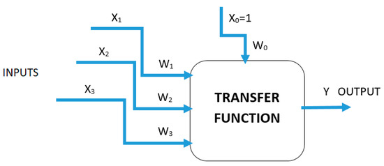 The typical signal route between neurons (processing units) is presented in Figure 3, where xi are the input signals of the neurons (or external input data for system), wi are the weights of the edge connections (synapses), w0 is the sensitivity threshold of the neuron (the so-called bias), and f (·) is a simple non-linear function, for example, a sigmoid or a logistic function. Activation (transfer) functions (AF) are possible for each hidden and output layer.