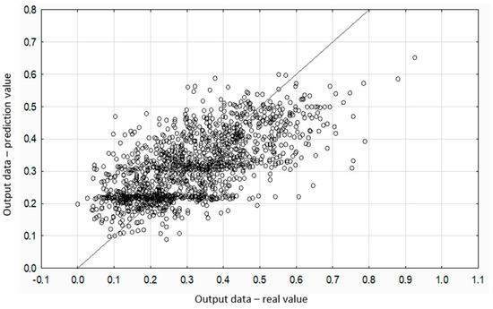 Figure 5 shows a diagram of the relationship between the actual and predicted values of the axle runout. The correlation model allows you to determine the expected values of one random variable on the basis of unit representations of another random variable with features of mutual correlation. The validation was performed using the set of input and output data, that were not used before. From the diagram, one can deduce the direction and strength of the correlation relationship. The points of the studied dependence are grouped along a hypothetical straight regression, indicating the strength of the correlation.